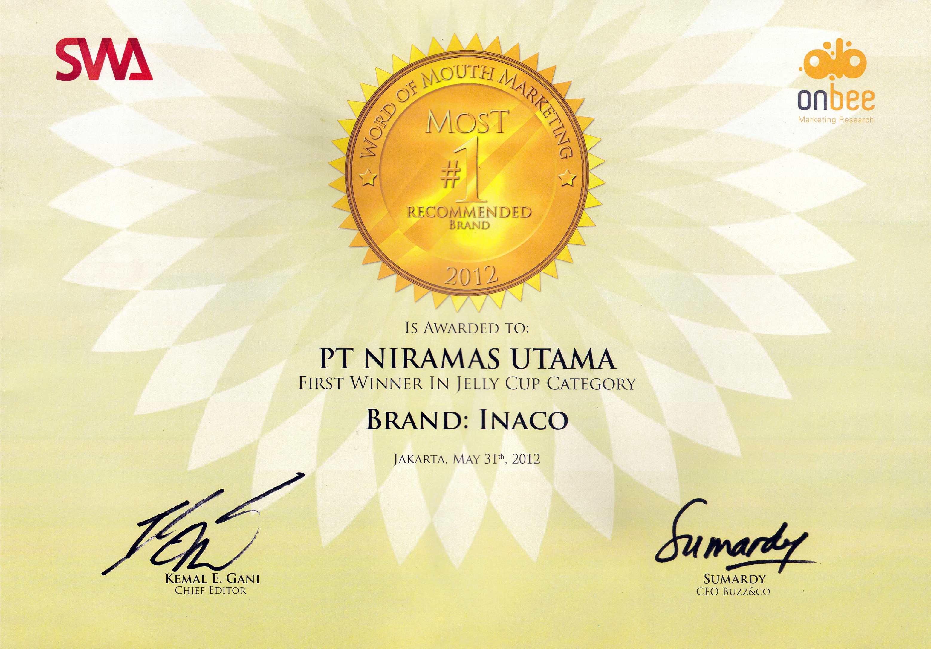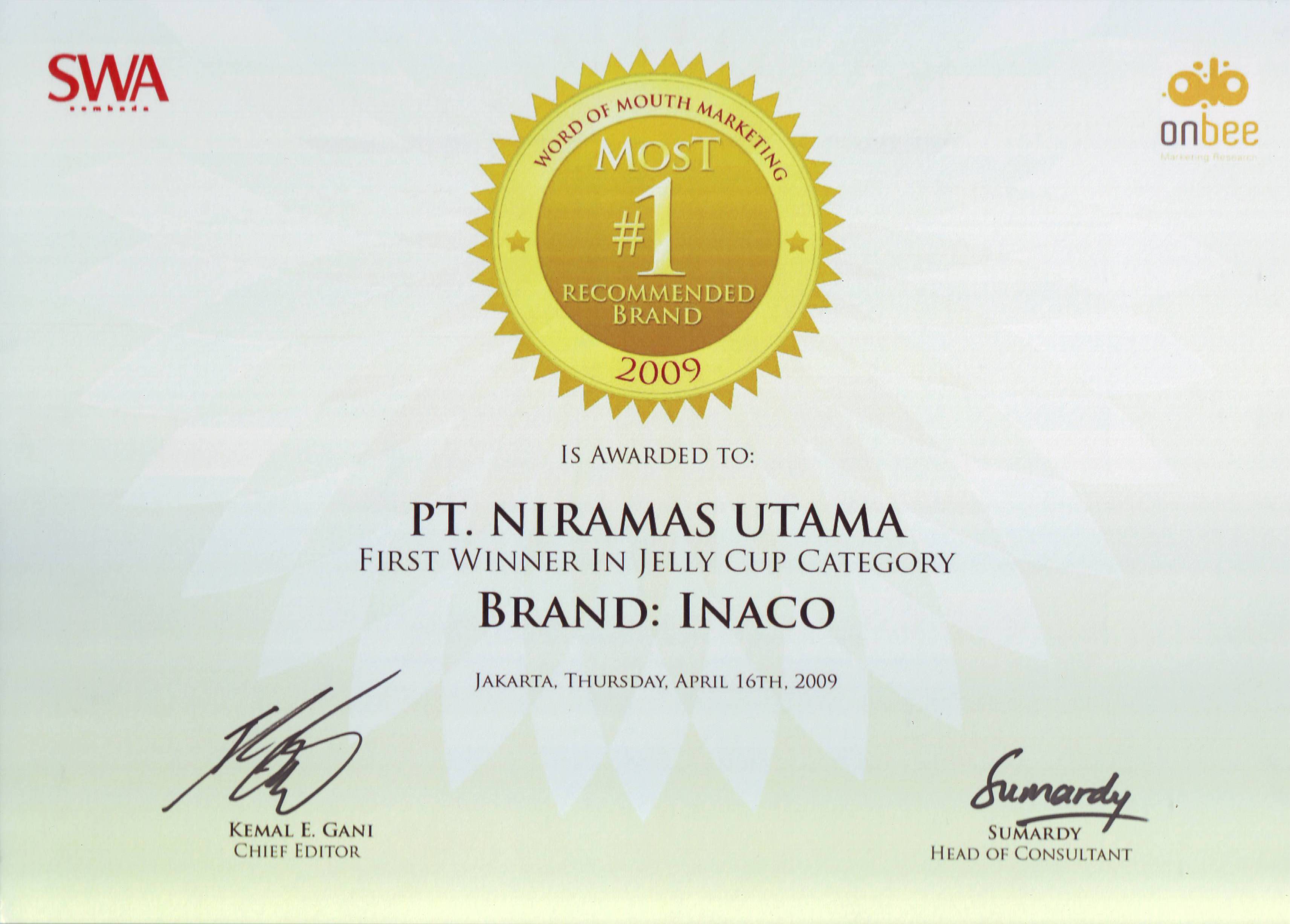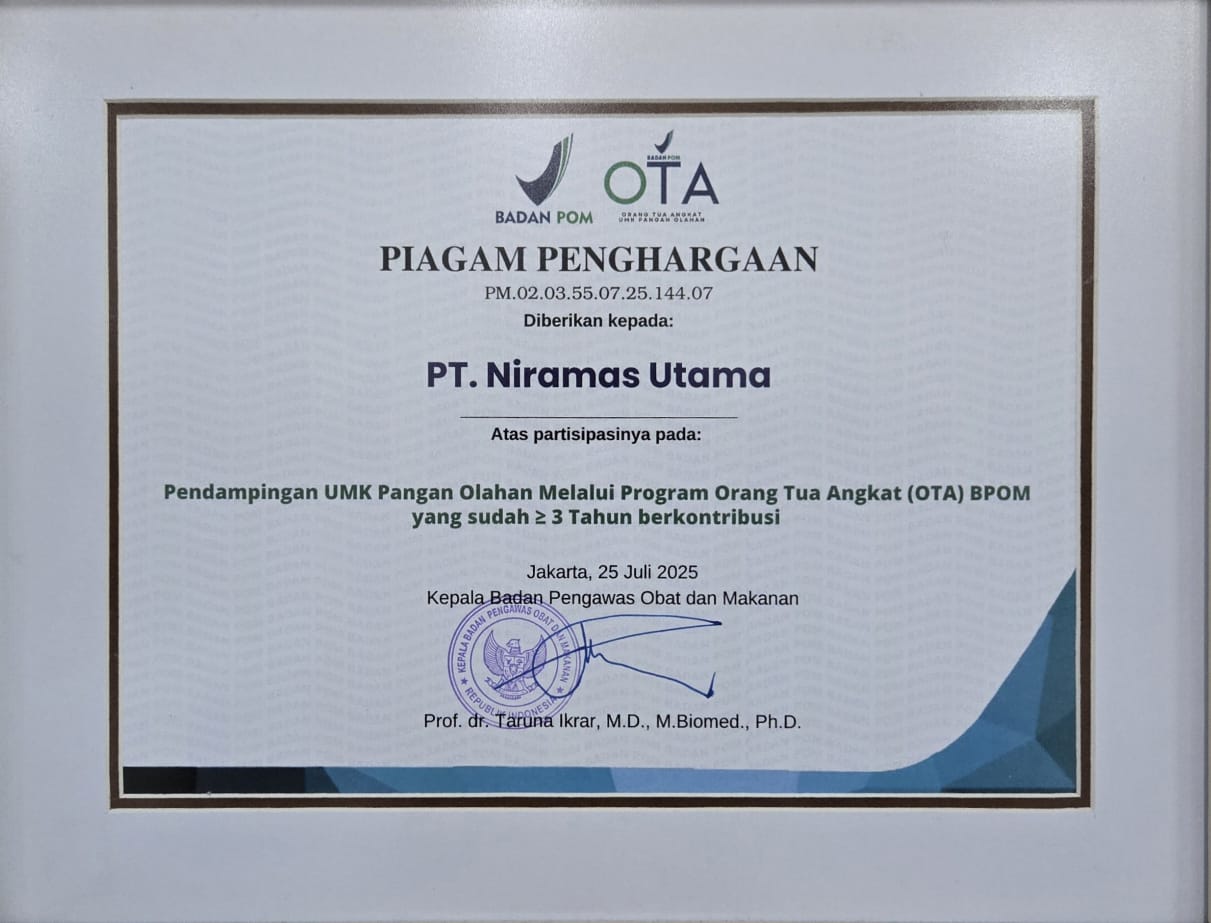 PT. Niramas Utama sangat bangga dengan komitmen kami untuk memproduksi produk yang berkualitas tinggi. Dedikasi kami ini telah menghasilkan banyak penghargaan dan pengakuan selama bertahun-tahun. Sebagaian penghargaan ini merupakan bukti dari upaya kami yang tiada henti untuk mencapai kualitas, inovasi, dan kepuasan pelanggan.